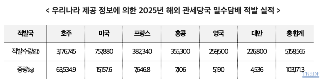 관세청(청장 이명구) 관세국경위험관리센터 정지은 센터장은 1월 7일 “2025년 한 해 동안 호주, 미국, 프랑스 등 주요 해외 관세당국과 긴밀히 협력해 우리나라를 밀수화물 경유 거점으로 삼은 다국적 담배 밀수 범죄를 단속한 결과, 해외 현지에서 사상 최대 규모인 총 516만 갑(약 103톤 분량)의 밀수담배를 적발·압수하는 성과를 거뒀다”고 밝혔다.