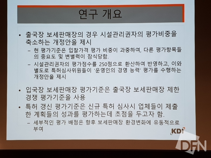▲사진=김선호 기자/ 공청회에서 발표된 입국장 면세점 '평가기준' 자료 |