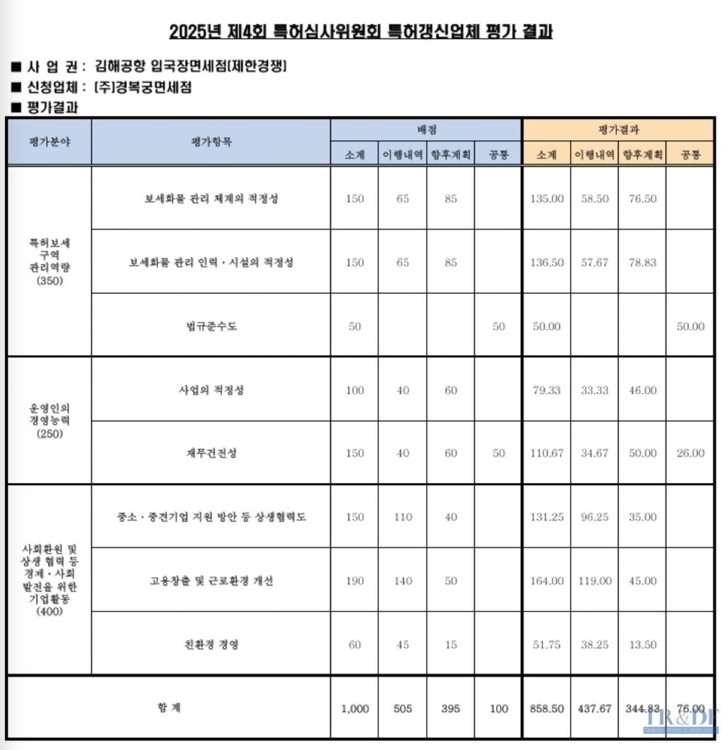 이날 특허심사는 관세청이 특허갱신심사 기준을 바꾼 방식으로 적용된 후 두 번째 사례이다. 경복궁면세점의 5년간 이행내역 평가를 500점 만점으로 하고 향후 5년간 사업계획 내역을 500점으로 평가해 각 500점을 합해 총점 1,000점으로 평가하는 방식이다.