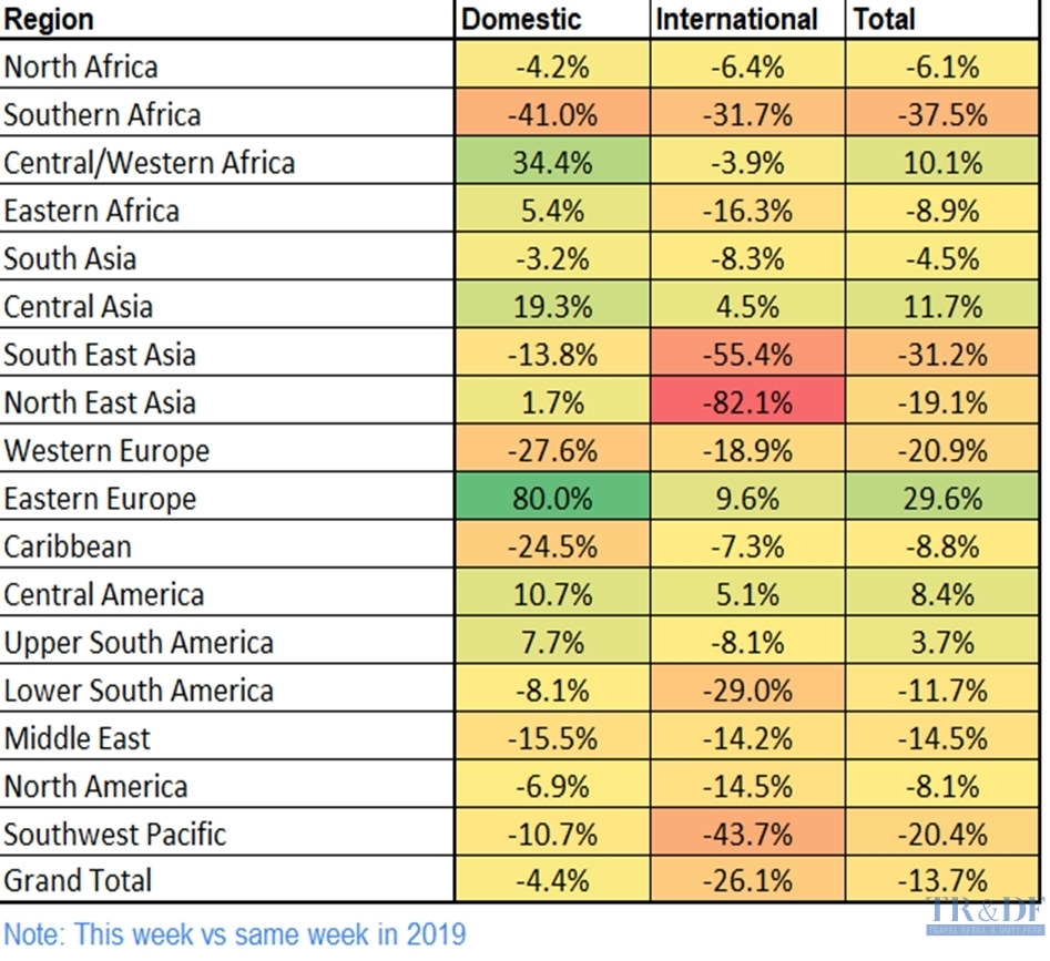 지난달의 경우 코로나 발생이전 2019년 7월에 대비하여, 전세계 항공기 운항편수는 약 83%에 다다랐다. 이 수치만 놓고 보면 코로나 영향으로 인한 격리와 봉쇄에서 약 80% 이상은 회복이 된 듯이 보이기도 하지만, 실은 항공시장을 국제선과 국내선 구분없이 합쳐서 볼 때 발생하는 착시효과 때문이다.