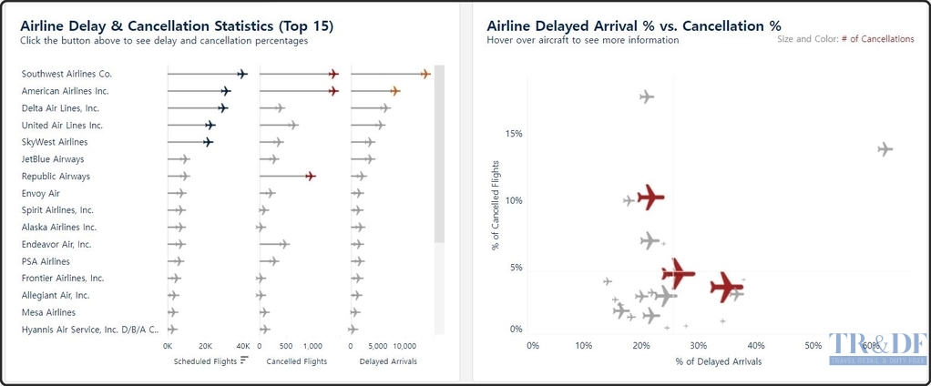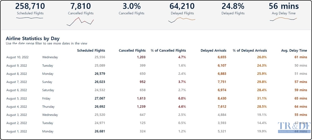 ▲ 출처=FlightAware 갈무리, https://public.tableau.com/app/profile/flightaware/viz/AirlineCancellationDelayUpdate/USAirlineCancellationsDelays, 2022.08.12. |
