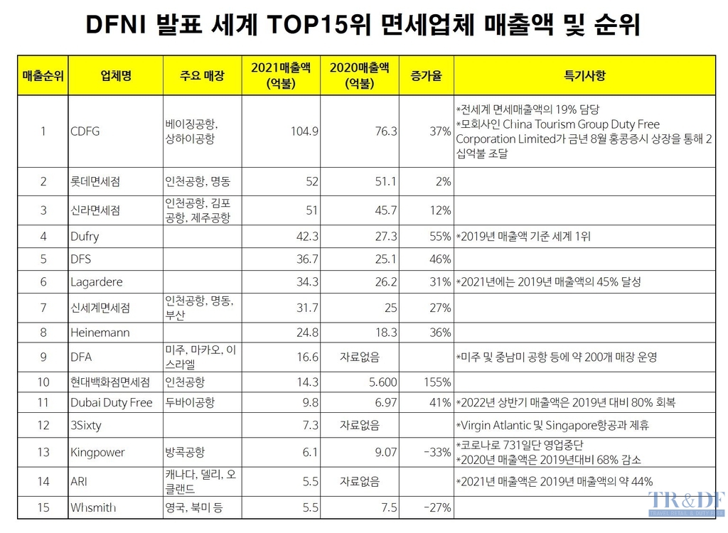 지난 10월 2일부터 6일까지 프랑스 칸에서 열린 TFWA(Tax Free World Association) 행사를 전후해 ‘DFNI(Duty Free News International)’는 코로나 이후 글로벌 면세업체 순위를 발표했다.