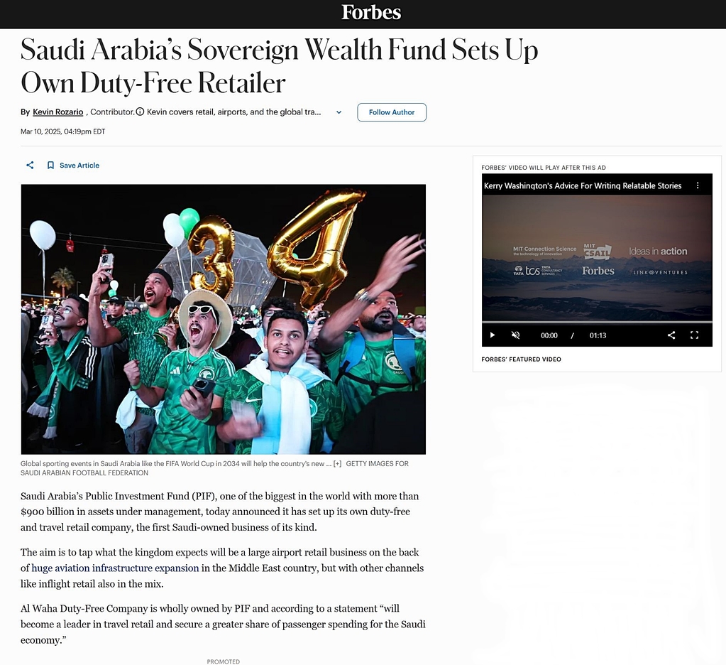 포브스지의 케빈 로자리오(Kevin Rozario) 기자는 3월 10일 “세계인의 축구 축제인 월드컵이 2034년 열리게 될 사우디아라비아의 공공투자펀드(PIF)가 자체 면세점 및 여행소매업을 담당할 회사인 알 와하(Al Waha Duty-Free Company)를 전액 투자해 설립했다”며 “향후 중동국가의 거대한 항공 인프라 확장에 힘입어 공항 면세점을 유치하는 것이지만 기내면세점은 물론 육로 국경면세점과 항구에도 면세점을 운영하는 것을 목표로 하고 있다”고 보도했다.