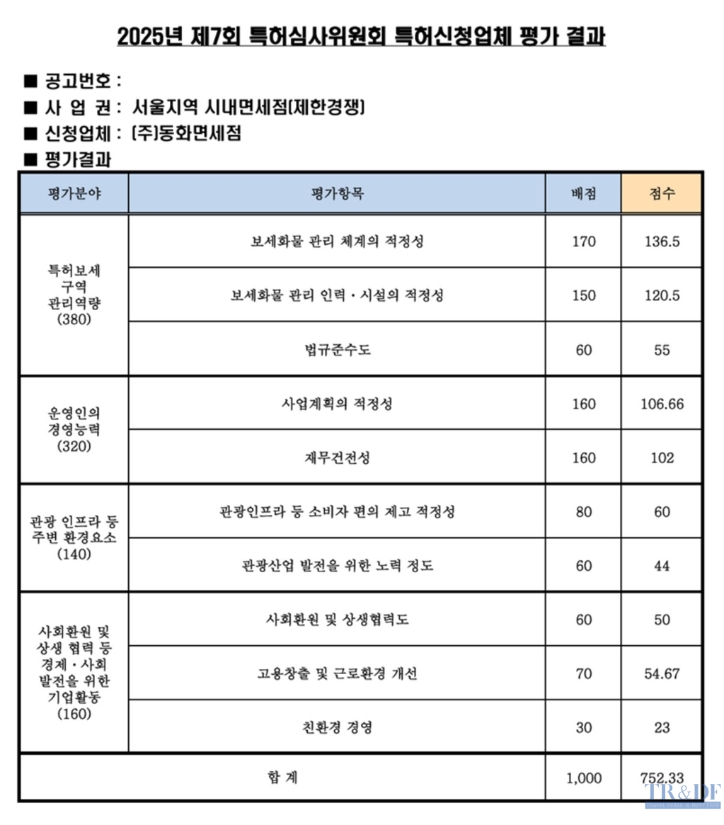위원장 박영태 교수는 “‘관세법시행령’ 제192조의5 제6항에 따라 위원회에 참석한 위원 명단과 서울 시내면세점 신규 특허 평가 결과를 공개하고 ㈜동화면세점은 총점 1,000점 만점에 752.33점을 획득했고 ㈜명동듀티프리는 696.5점을 획득해 두 곳 모두 승인됐다”고 공개했다