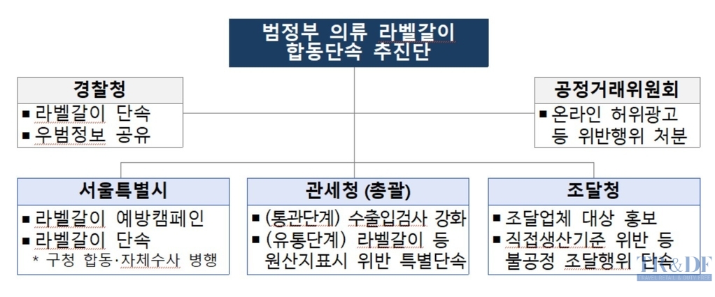 관세청(청장 이명구) 공정무역심사과 윤지혜 과장은 9일 “정부 차원에서 관세청이 공정거래위원회, 조달청, 경찰청, 서울특별시와 함께 외국산 의류의 원산지 라벨을 제거하고 국산 라벨로 갈아 붙여 유통・판매하는 ‘라벨갈이’ 행위를 근절하기 위해 2월 9일(월)부터 5월 19일(화)까지 100일간 범정부 합동 기획단속을 실시한다”고 밝혔다.