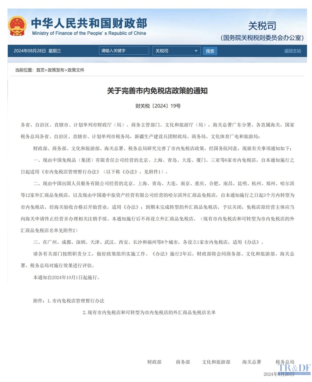 무디리포트는 지난 27일 “중국 재무부, 상무부, 문화관광부, 세관총서, 국가세무총국이 현재의 시내면세점 정책을 연구하고 개선한 결과 중국 본토에 다수의 시내면세점을 신규로 설립하는 안에 대해 국무원의 승인을 받아 발표 했다”고 밝혔다. 해당 정책에 대한 구체적인 내용은 10월 1일 발표될 것으로 보인다.