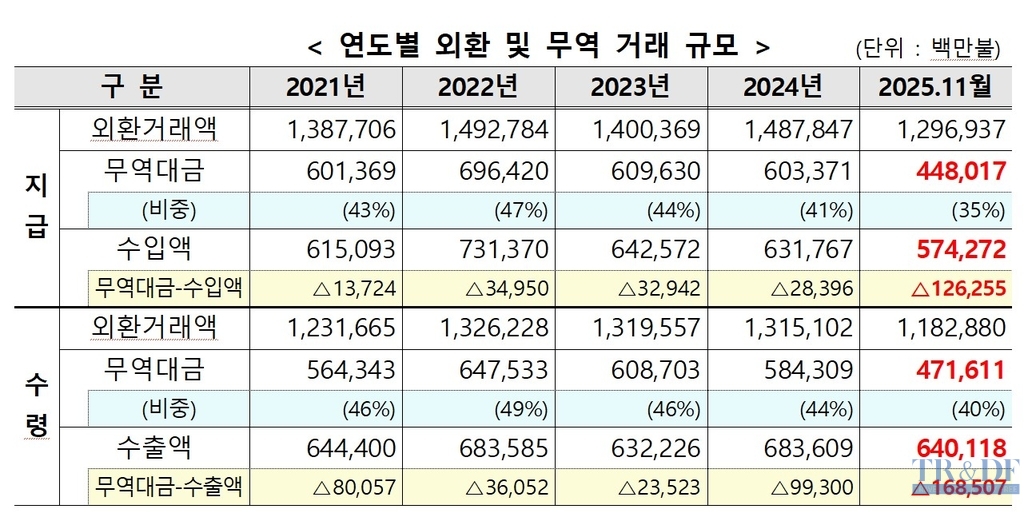조과장은 “외국환거래규정 제5-8조제1항제2호에 따라 10만 달러를 초과하는 수입대금을 선적 전 1년을 초과하여 지급하는 경우에는 한국은행총재에게 신고할 의무가 있으나 이를 회피하고 있다”며 “올해 은행에서 지급·수령된 무역대금과 세관에 신고된 수출입금액 간의 편차는 지난 5년 중 최대치(약 2,900억 달러, 427조 원)에 이르는 등 원활한 외화의 순환이 이뤄지고 있지 않아, 전반적인 무역거래에 대한 점검이 시급한 상황”이라고 지적했다.