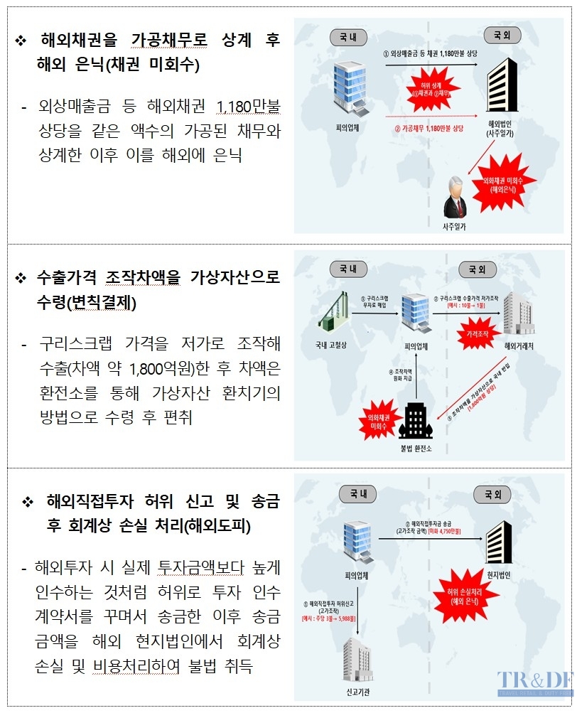 ‘대금미회수’는 국내에 들어와야 할 무역대금을 신고, 사후보고 없이 장기 미회수하거나 허위신고를 통해 회수를 부당하게 회피하는 행위를 말하며 ‘변칙결제’는 무역거래 시 달러 등 외화채권을 반입하는 대신, 환치기·가상자산 등 대체수단을 통한 영수로 달러 유동성 확대를 저해하는 행위다. 마지막으로 ‘해외도피’는 수출가격을 저가로 신고하여 부당히 차액을 해외에 유보하거나 수입가격을 고가로 신고하여 부당히 많은 외화를 해외에 유출하는 행위다.