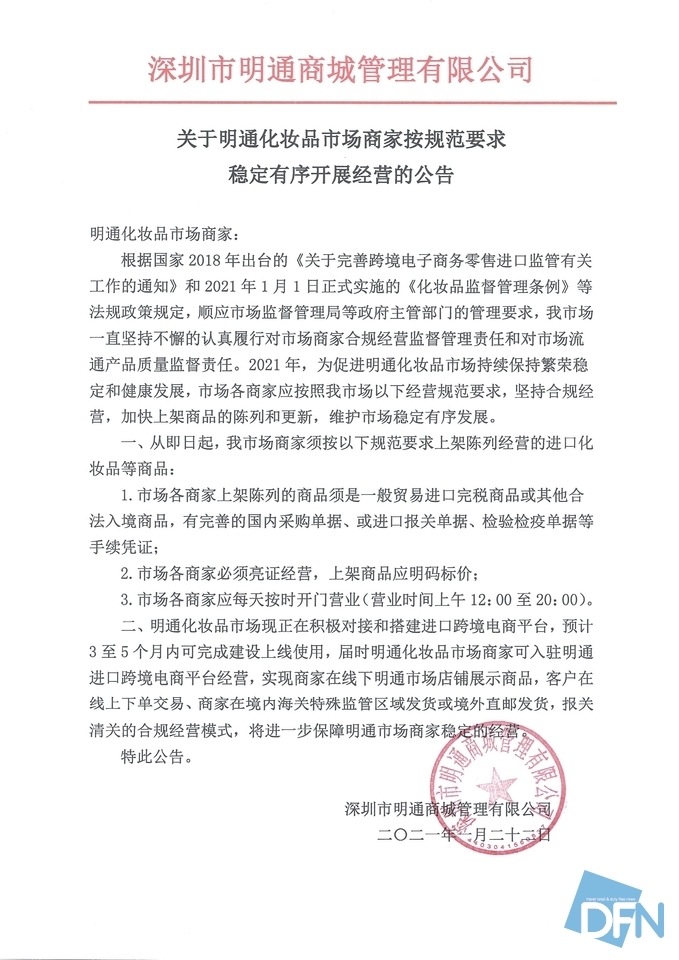 ▲ 사진=선전시 밍퉁상가관리유한공사 공고문(2021.01.22) |