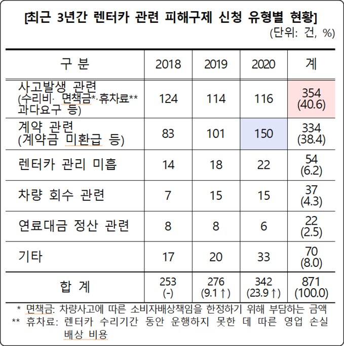 장은 “2018년~2020년 3년간 접수된 렌터카 소비자 피해구제 신청 871건을 분석한 결과, 신청건수에서는 2년 연속 증가했고 특히 2020년의 경우 전년대비 23.9% 증가했다”고 말했다. 송 팀장은 “피해구제 신형 유형을 분류한 결과 차량 사고 발생시 렌터카 회사의 비용 과다청구가 40.6%(총 354건)로 렌터카 수리비는 물론 면책금·휴차료 등을 과다하게 요구한 경우를 지적했고, 2020년의 경우에는 코로나로 인해 사회적 거리두기 시행에 따라 예약취소를 해야 함에도 계약금을 돌려주지 않거나 위약금을 과다하게 청구하는 피해가 43.9%(총150건)으로 가장 많은 사례를 기록했다”고 전했다.