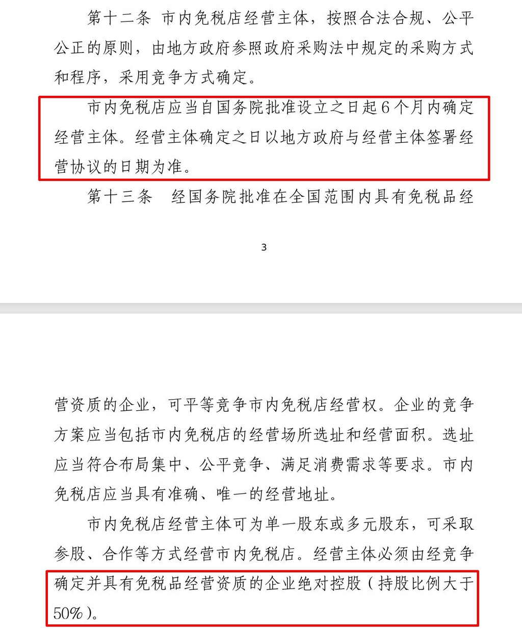 중국 당국이 앞서 8월 28일 발표한 고시에 부칙으로 공개된 ‘시내면세점 관리에 관한 경과조치(市内免税店管理暂行办法)’ 12조와 13조를 보면 자세히 내용을 알 수 있다. 먼저 13조의 경우 면세점 특허에 관한 내용으로 “시내면세점의 사업주체가 단일 주주 또는 다중 주주가 가능하며 면세품을 운영할 자격이 있다고 판단된 기업은 절대적인 지배력(지분 50% 이상)을 가져야 한다”고 규정하고 있다. 따라서 이미 특허를 획득한 CDFG나 왕푸징 그룹은 중국내에서 가장 경쟁력 있는 면세기업으로 인정받았다.