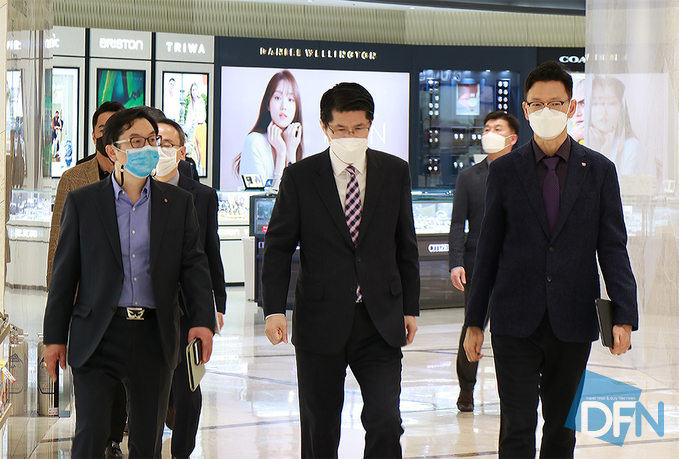 ▲ 사진=김재영 기자 / 롯데면세점 월드타워점 9층 라이브방송 현장점검을 위해 들어오는 김광호 세관장(사진 가운데), 롯데면세점 한국사업본부장 이종환 전무(사진 왼쪽), 롯데면세점 월드타워점 점장 박상호 상무(사진 오른쪽), 2021.4.21 |
