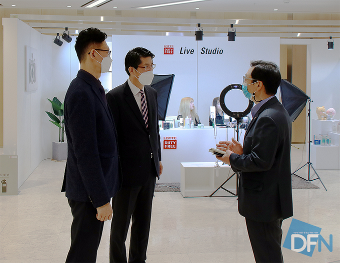 ▲ 사진=김재영 기자/롯데면세점 월드타워점 라이브방송 현장을 참관중인 김광호 세관장(사진 가운데), 롯데면세점 한국사업본부장 이종환 전무(사진 오른쪽), 롯데면세점 월드타워점 점장 박상호 상무(사진 왼쪽), 2021.4.21 |