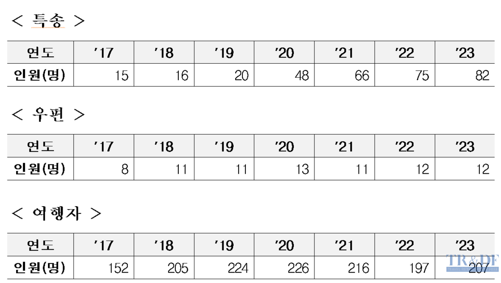 ▲ 도표=더불어민주당 진선미 의원실 제공, 관세청 특송·우편·여행자 분야 전문인력 증가(2017~2023), 2024.03.05. |