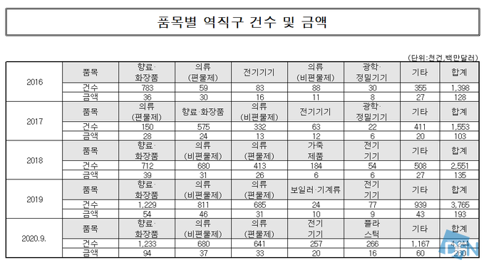 국회 기획재정위원회 소속 박홍근 의원이 관세청으로부터 제출 받은 ‘역직구 현황’을 보면 2020년 9월 기준 전자상거래 수출은 1,840만 9,000건으로 지난해 실적인 1,319만 8,000건을 넘어서 역대 최대 기록을 기록한 것으로 나타났다. 품목별로는 향료와 화장품이 2016년부터 2020년 9월까지 전체 역직구 건수의 33%를 차지해 5년 연속 1위를 차지했다. 문제는 면세점도 국내 역직구 시장과 마찬가지로 화장품 품목의 판매 비중이 높다는 점이다.
