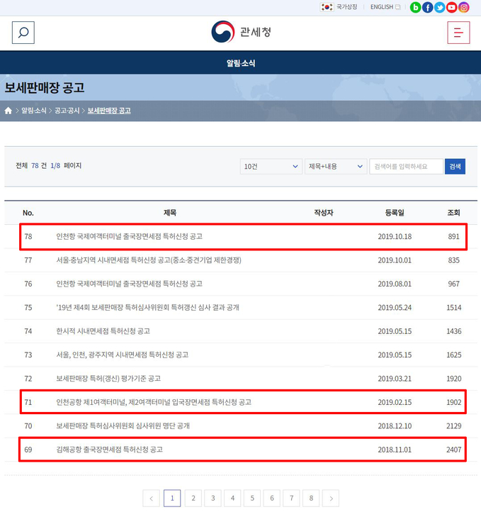 ▲사진=관세청 홈페이지 보세판매장 공고 |