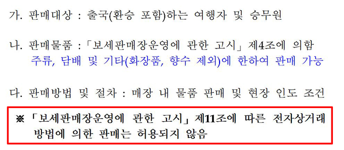 관세청(청장 노석환)은 23일 “출국장면세점은 ‘보세판매장운영에 관한 고시(이하 보판장 운영 고시)’ 제11조에 따른 전자상거래 방법에 의한 판매는 허용되지 않는다”고 재차 공식 확인했다. 관세청 대변인실 관계자는 “관세청 홈페이지에 공개되어 있는 과거 공항 및 항만 등 출국장면세점 입찰공고에 해당 내용이 확인되어 있다며 이번 인천공항 입찰공고에도 해당 내용이 동일하게 적용될 예정”이라고 말했다.