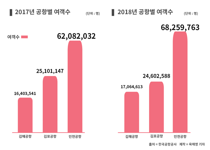 한국공항공사 ‘공항별 통계’에 따르면 지난해 김포공항 이용 여객수는 총 24,602,588명이다. 김해공항은 총 17,064,613명으로 김포공항보다 무려 7,537,975명 적다. 작년 뿐만이 아니다. 2017년 김포공항의 총 이용객 수가 김해공항보다 월등히 많다.