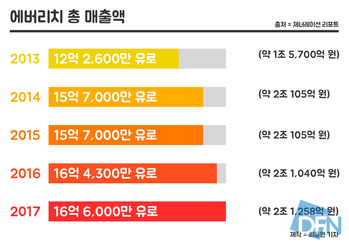 이런 악재에도 불구하고 '에버리치 면세점'의 매출액은 완만한 상승세를 보이고 있다. '에버리치 면세점'은 지난 2013년 12억 2,600만 유로(약 1조 5,700억 원)의 매출을 기록하다가 '골든 레이크 플라자'를 개장한 2014년 15억 7,000만 유로(약 2조 105억 원)로 28% 성장했다. 이후 안정된 대만 시장을 바탕으로 2015년 15억 7,000만 유로(약 2조 105억 원), 2016년 16억 4,300만 유로(약 2조 1,040억 원), 2017년 16억 6,000만 유로(약 2조 1,258억 원)의 매출을 올리고 있다.