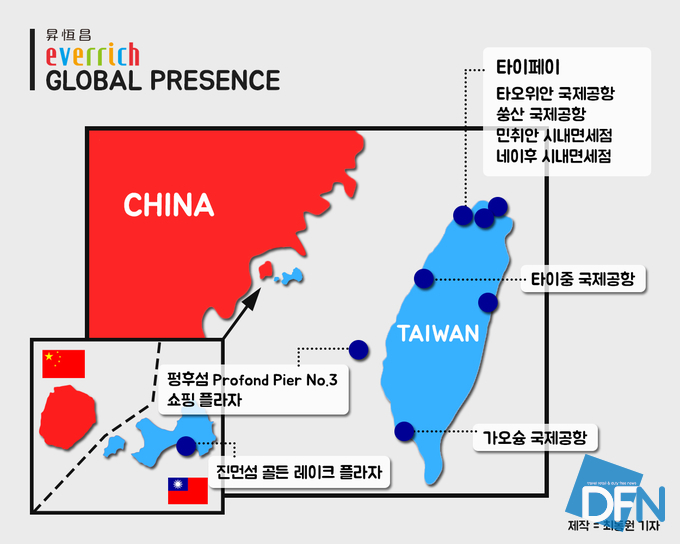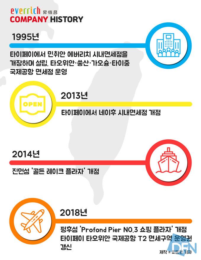'에버리치 면세점'은 1995년 설립 이후 타오위안·쑹산·가오슝·타이중 등 4개 국제공항에서 면세점을 운영하며 대만 면세 시장의 주요 사업자로 자리매김했다. 특히 대만 공항 면세점의 특허 기간은 12년+3년, 총 15년까지 늘어날 수 있어 장기 운영 사업자로 군림했다. 이후 중국과 대만 간의 관계가 회복되면서 중국인 관광객들이 늘어나면서 본격적인 사업 확장에 나선다.