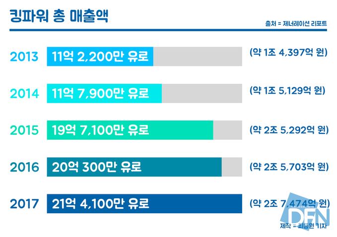 킹파워의 매출은 13년 11억 2,200만 유로(약 1조 4,397억 원), 14년 11억 7,900만 유로(약 1조 5,129억 원)로 소폭 상승을 이어가다 15년에 19억 7,100만 유로(약 2조 5,292억 원)로 67% 껑충 뛰어오른다. 이후 16년 20억 300만 유로(약 2조 5,703억 원), 17년 21억 4,100만 유로(약 2조 7,474억 원)로 완만한 성장세를 기록중이다. 15년 자국 시장 확대에 따른 급격한 성장과 이후 안정적 운영으로 풀이할 수 있다.