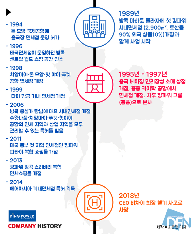 2011년 태국 동부지역 최초 시내면세점으로 킹파워 파타야 복합 쇼핑몰을 오픈하고 2013년에는 방콕 스리바리 복합 면세쇼핑몰을 개점하며 자국내 입지를 완벽히 세웠다. 16년에는 면세와 전혀 다른 이종사업으로 영국 프리미어 리그 '레스터 시티'를 인수, 막대한 자본투자를 바탕으로 6년만에 리그 우승에 성공한다. 태국내 지역 사업자에서 유럽에 이름을 알리는 기업 다각화의 대표적인 성공사례로 꼽혔다. 그러나 18년 10월 킹파워를 성공가도로 이끈 전 CEO '비차이' 회장이 탄 헬기사고로 사망해 '킹파워'의 미래가 어떻게 될 것인지 업계의 관심이 쏠리는 중이다.