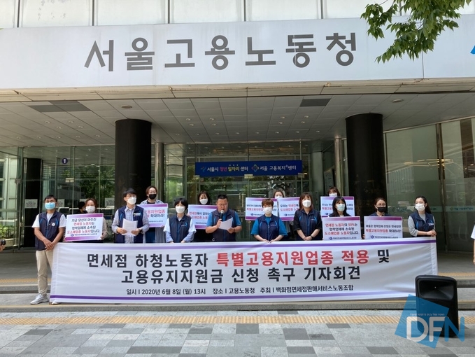 백화점면세점판매서비스노동조합(위원장 하인주,이하 노동조합)이 8일 오후 1시 고용노동부 서울지방고용노동청 정문 앞에서 ‘면세점 하청노동자 특별고용지원업종 적용 및 고용유지지원금 신청 촉구 기자회견’을 열었다. 이날 김수현 노동조합 교선국장은 “정부가 ‘코로나19’로 타격이 심한 면세점업을 특별고용지원업종으로 추가 지정했지만 정작 면세점 하청노동자들이 지원 대상에서 제외되어 고용 사각지대에 놓여 있다”고 주장했다. 정부가 현장 상황을 반영하지 않고 ‘탁상행정’을 펼치고 있어 이에 대한 추가 대책이 필요하다는 지적이다.