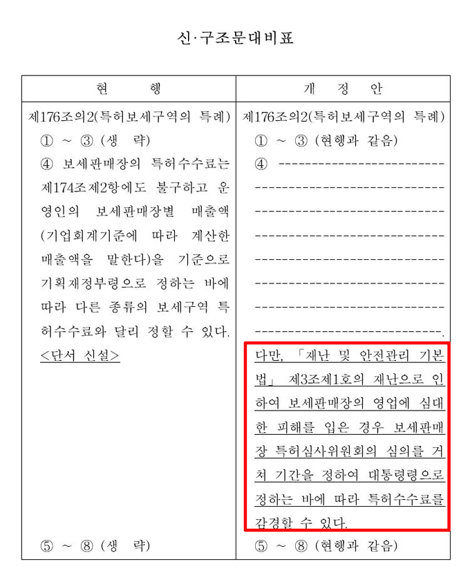 구체적으로 법안 내용은 관세법 제176조의2 특례조항에 특허수수료 항목에 단서를 신설하는 것이다. 위 조문처럼 “‘재난 및 안전관리 기본법’ 제3조제1호의 재난으로 인하여 보세판매장의 영업에 심대한 피해를 입은 경우 보세판매장 특허심사위원회의 심의를 거쳐 기간을 정하여 대통령령으로 정하는 바에 따라 특허수수료를 감경할 수 있다”가 추가되는 내용이다.