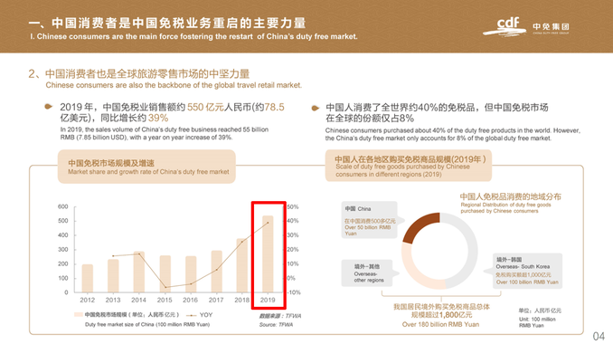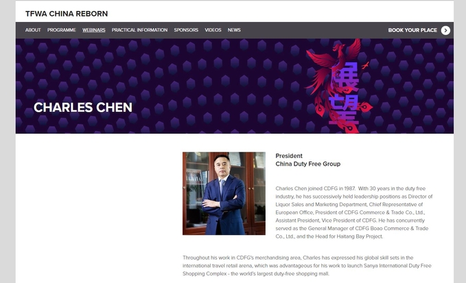 TFWA 알랭 맹그로브 회장은 1일 대회 개회사를 통해 “중국의 CDFG(China Duty Free Group)가 2020년 1월~6월까지 매출 기준으로 세계 최대 업체로 자리했다”며 “중국 정부가 하이난섬을 새로운 자유 무역 항구로 개발하는 과정에서 면세한도의 증액, 신규 면세 특허의 허가, 경쟁정책의 도입 등 다양한 정책적인 지원을 통해 급격히 시장의 변화를 추구하게 됐다”고 언급했다. 사실상 코로나19로 인해 세계 면세기업의 순위가 혁명적으로 변화한 것을 짚은 것이다.