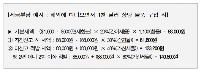 관세청이 예시로 밝힌 사례를 보면 해외에서 1천 달러에 상당하는 물품 구매시 기본적으로 내야할 세금은 88,000원 이다. 면세한도 600달러를 제한 400달러에 대해 간이세율 20%를 적용해 계산한 결과다. 자신 신고할 경우는 30%의 감면율이 적용돼 26,400원을 제한 61,600원이다. 그러나 미신고 적발시 가산세 40%가 적용돼 35,200원을 추가한 123,000원을 내야 한다.