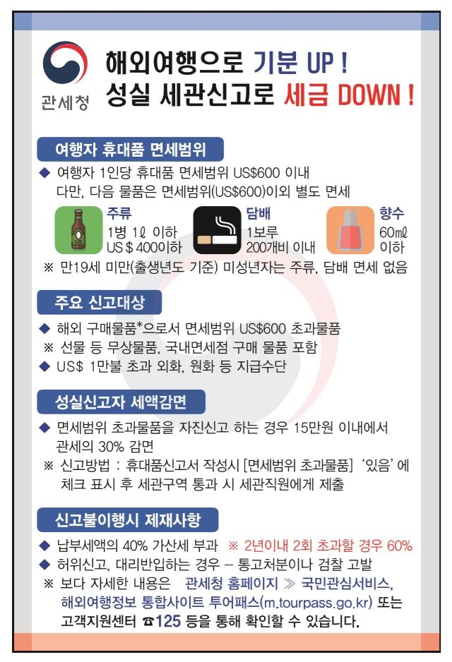 관세청(김영문 청장)은 본격적인 휴가철을 맞아 “7월 29일(월)부터 8월 18일(일)까지 3주간 해외여행객을 대상으로 면세한도 초과에 따른 자진신고를 적극 유도한다”고 밝혔다. 현행 면세한도는 미화로 600달러다. 면세점 또는 해외에서 현행 면세범위 600달러를 초과하여 물품 구매시 스스로 신고할 경우 15만원 한도내에서 관세의 30%를 감면해 준다.