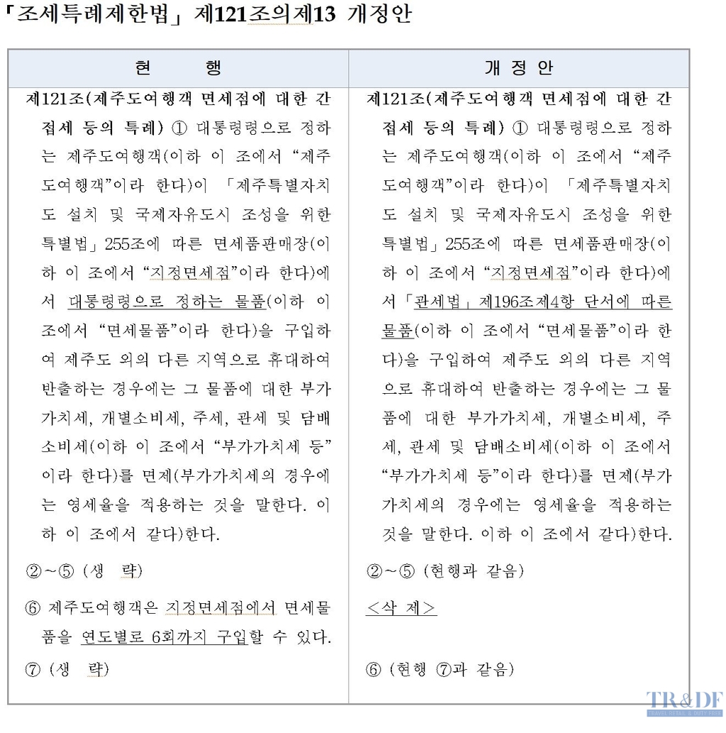 JDC(양영철 이사장, 제주국제도시자유개발센터) 면세점이 지난해 말부터 국회를 통해 JDC면세점 제도개선을 시도하고 있다. 이미 지난해 12월 27일 국민의 힘 김정재 의원(경북 포항시 북구)실에서 대표 발의한 ‘조세특례제한법 일부개정법률안(의안번호 7032)’을 의원 입법한 상황이다. 해당 법안에는 JDC면세점이 판매 품목을 17개 품목으로 제한하고 있는 점과 연간 6회 구매가 가능하도록 제한을 가하고 있는 점을 개정해 관세법에서 규정하고 있는 시내면세점이 취급하는 전품목으로 확대하고 횟수를 12회로 늘리는 내용을 골자로 하고 있다.