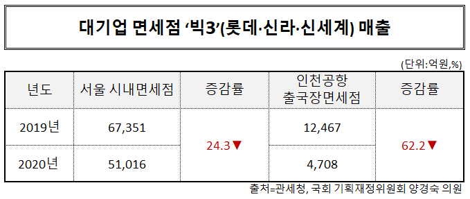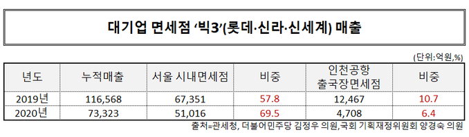 이 차이는 코로나19 사태가 발생한 2020년 더욱 벌어졌다. 국회 기획재정위원회 더불어민주당 양경숙 의원실이 공개한 2020년 국내 면세점 상반기 총 누적매출은 7조3,323억원이었다. 특히 대업 면세점 3사의 서울 시내면세점 매출은 5조1,016억원으로 총 매출에서 69.6% 비중을 차지해 코로나19 위기 이전보다 매출 집중도가 더 높아졌다. 반면 같은 기간 대기업 면세점 3사의 인천공항 출국장면세점 매출은 총 4,708억원으로 전체 매출의 6.4%에 그쳤다.