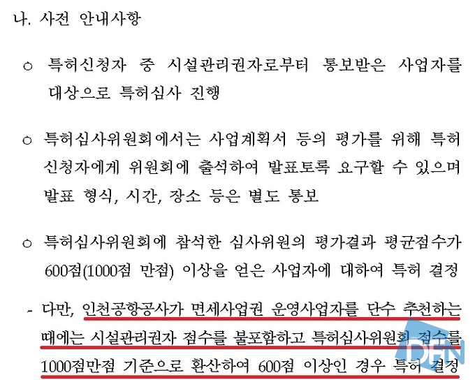따라서 인천공항이 단수 추천할 경우 인천공항의 평가점수 250점은 총점에 포함되지 않는다. 관세청 특허공고 기준상의 평가항목 점수인 750점이 총점 1,000점으로 환산된다. 이때 환산된 점수가 600점 이상을 얻은 면세 사업자가 특허를 부여받게 된다. 이를 두고 인천공항 홍보팀은 “복수사업자로 선발했을 경우 업체간 점수가 달라 변별력이 필요해 시설관리자 점수가 필요했다”며 “다만 단수사업자 선발방식의 경우에는 한 업체만 후보기 때문에 시설관리자 점수가 포함되지 않아도 별다른 영향이 없다”고 밝혔다.
