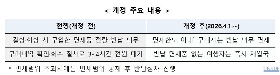 관세청(청장 이명구) 통관국 보세산업과 김진선 과장은 1일 “4월 1일(수)부터 천재지변이나 기체 결함 등 불가피한 사유로 인해 항공기가 회항하거나 결항할 경우, 사전에 구입한 면세품 의 반품 및 회수를 위해 여행객이 공항에서 장시간 대기해야 했던 불편이 사라진다”고 밝혔다. 지난 2월 27일 재정경제부가 실시한 세제 개편안 후속 시행규칙 개정에 따른 실질적인 조치가 4월 1일부터 효력을 발휘하게 된 것으로 보인다.