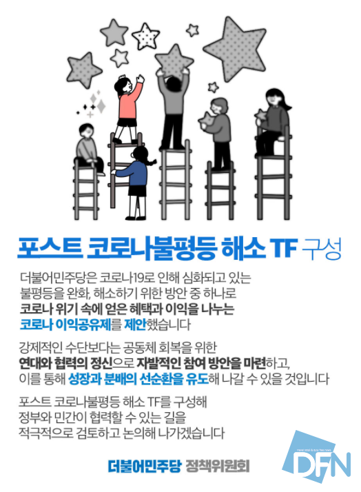또 더불어민주당은 지난 12일 ‘포스트 코로나 불평등 해소 및 재정 정책 태스크포스(TF)'를 구성하고 본격적으로 코로나 이익공유제 논의에 나선다고 밝혔다. 더불어민주당 정책위원회는 “코로나19로 인해 심화되고 있는 불평등을 완화, 해소하고 위한 방안 중 하나로 코로나 이익공유제를 제안했다”며 “강제적인 수단보다는 공동체 회복을 위한 연대와 협력의 정신으로 자발적인 참여 방안을 마련하고 이를 통해 성장과 분배의 선순환을 유도해 나갈 수 있을 것으로 기대한다”고 밝혔다.