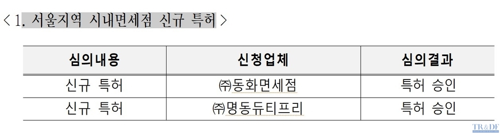 관세청 보세판매장 특허심사위원회(위원장 동의대 박영태 교수)는 12월 17일 “충남 천안소재의 JEI재능교육연수원에서 특허심사위원 19명과 ‘제7회 보세판매장 특허심사위원회’를 개최해 서울지역에 중소중견면세점 특허를 신청한 ㈜동화면세점과 ㈜명동듀티프리의 신규 면세점 특허신청을 승인했다”고 밝혔다.