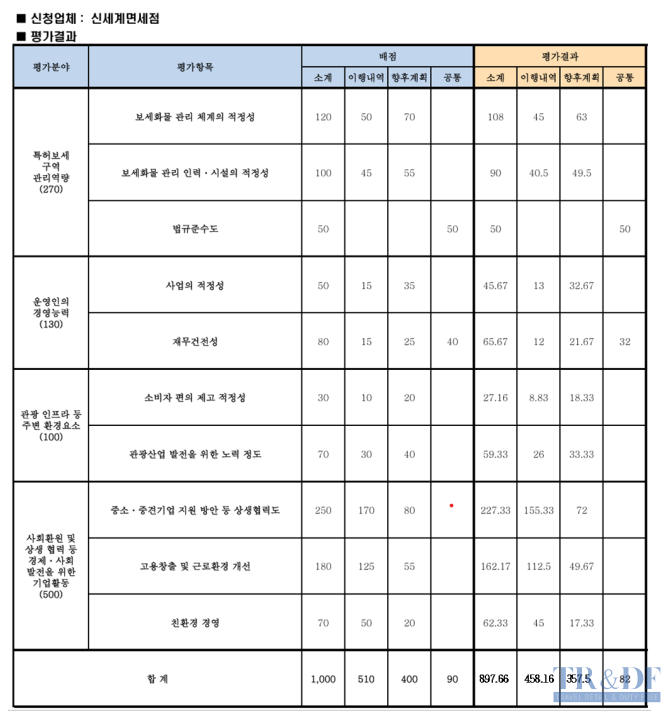 서울 시내면세점 특허갱신을 신청한 신세계면세점 명동점의 경우 변경된 특허심시 기준에 따라 총점 1,000점 만점에 897.66점이라는 매우 높은 점수를 획득해 특허갱신이 승인 됐다.